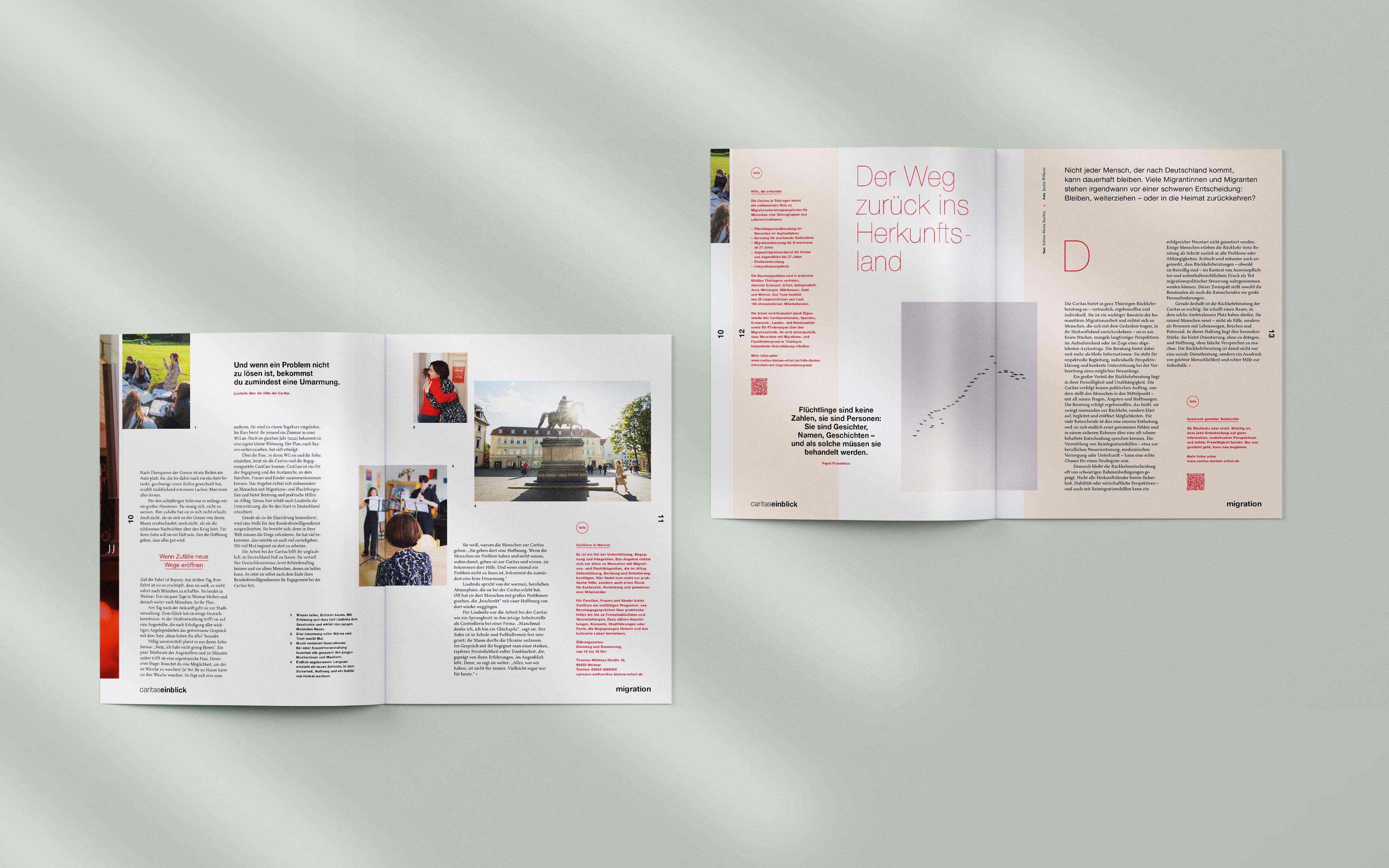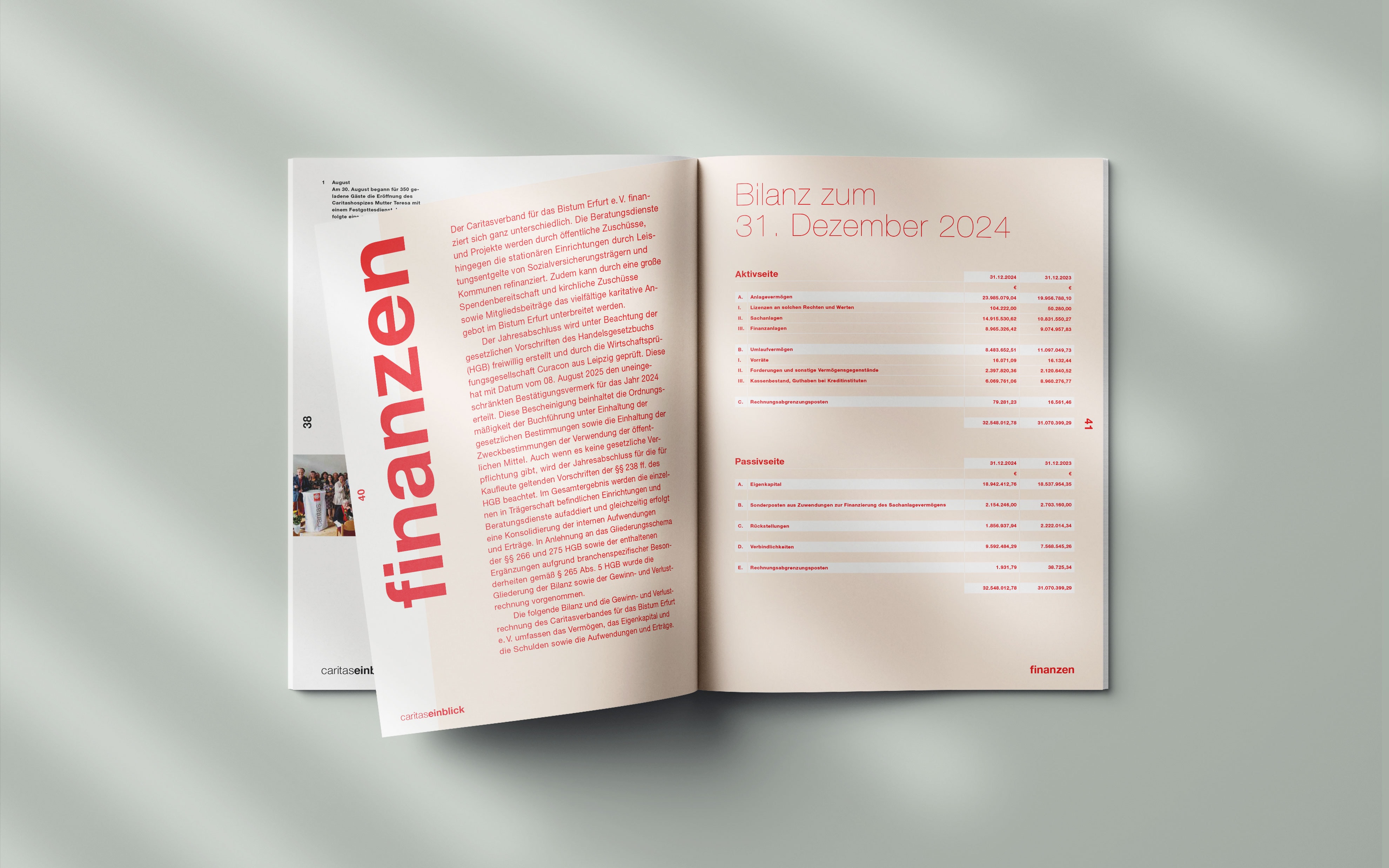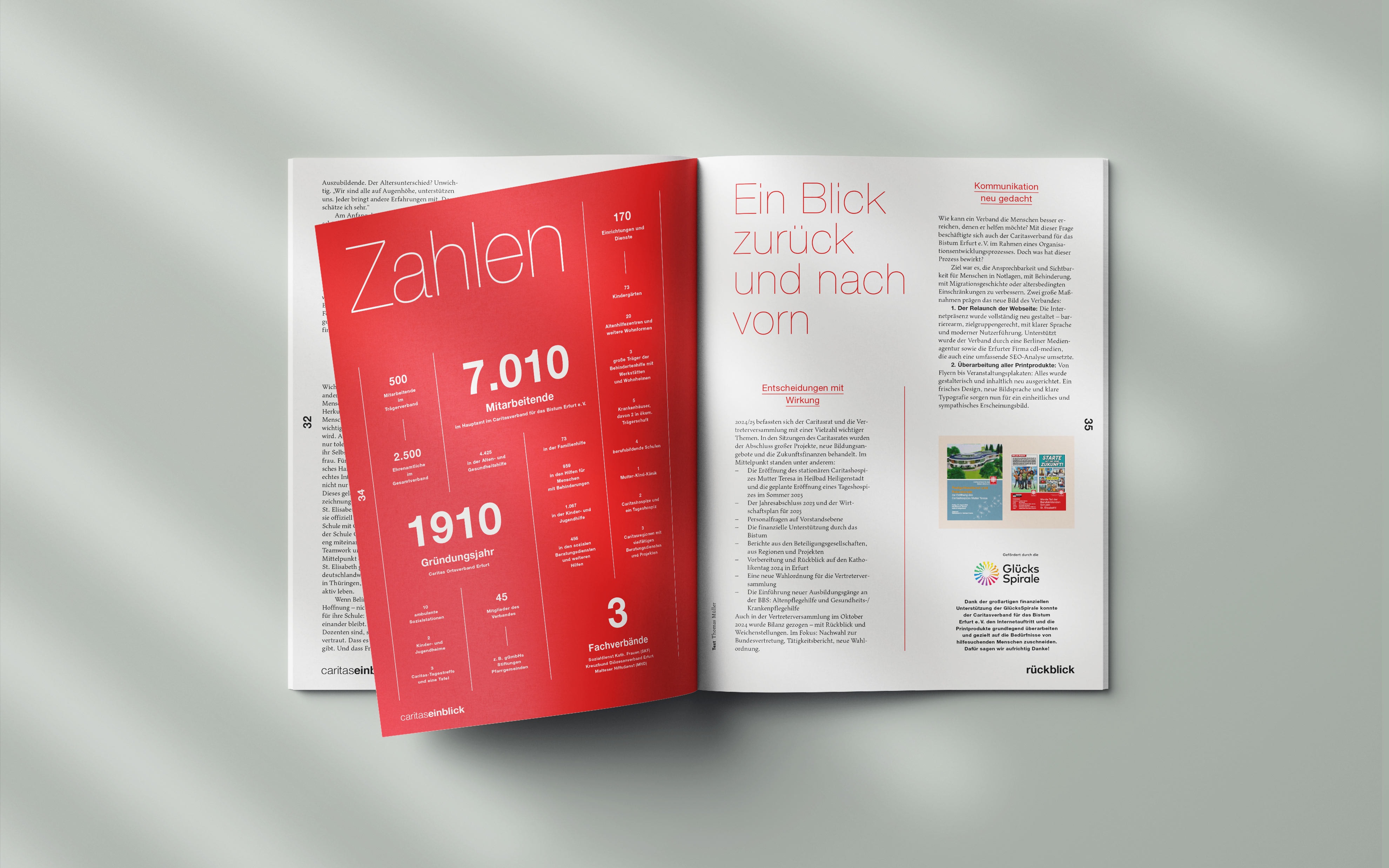 Für den Caritasverband für das Bistum Erfurt e. V. entwickelte Studio Botschaft ein neues Magazin, das zugleich als Geschäftsbericht dient. Aufmerksam wurde Caritas Erfurt auf uns durch den erfolgreichen Caritas Report für die Erzdiözese München und Freising e. V.